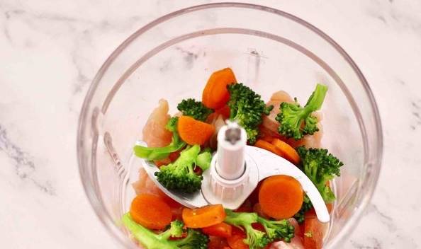 3.雞胸肉切小丁放入料理機,再放入焯過水西蘭花和胡蘿卜攪打成泥。