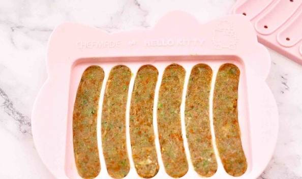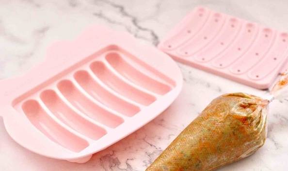 8.把裝在裱花袋的雞肉餡,擠入學廚的KT香腸模具裡,稍微輕輕振幾下。