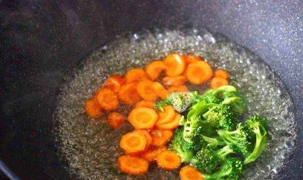 2.把西蘭花撕成小朵,胡蘿卜切成薄片,鍋中倒入適量的清水燒開,把西蘭花和胡蘿卜焯水,看見西蘭花和胡蘿卜,變色斷生撈出瀝幹水分備用。