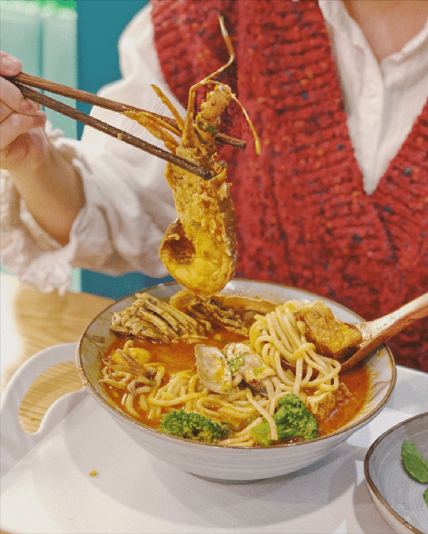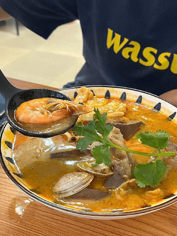 所以就排隊點瞭一份,價格不算便宜,三十幾塊錢一份面。上來的時候驚訝到我,湯完全蓋過面,然後上面就放著兩隻蝦,還有兩顆魚丸,然後就沒有瞭。我以為味道會很好吃,沒想到,不能說難吃,隻能說非常一般。