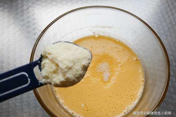 3、用筷子沿著一個方向把蛋黃攪打成糊狀,直打到蛋黃顏色發白、略微粘稠的狀態就可以瞭。加入三勺奶粉,用鏟子上下翻拌均勻。