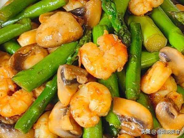 5、再次起鍋燒油,油熱後放入口蘑翻炒一會兒,炒至口蘑變軟後放入蘆筍和蝦仁翻炒均勻,炒熟後加入生抽、蠔油、胡椒粉調味,翻炒均勻入味即可出鍋裝盤開吃。