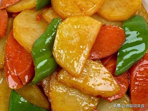 1、土豆削掉外皮,清洗幹凈後切成片。火腿斜切成片,青椒洗凈後切成塊。