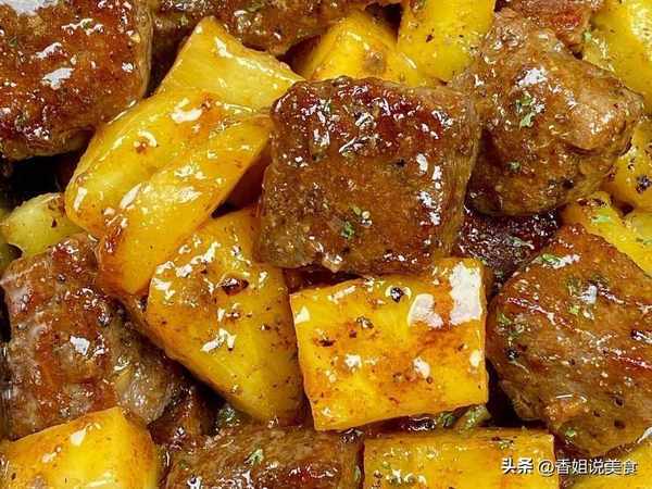 3.、起鍋燒油,油熱後放入牛肉翻炒一會兒,炒熟後放入菠蘿翻炒均勻,最後加入一點黑胡椒粉和歐芹碎,翻炒幾下即可出鍋開吃。