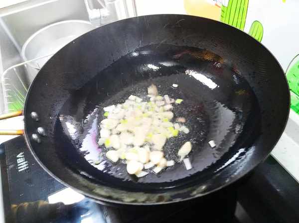 5,鍋中放底油,放蔥花和蒜片炒香。
