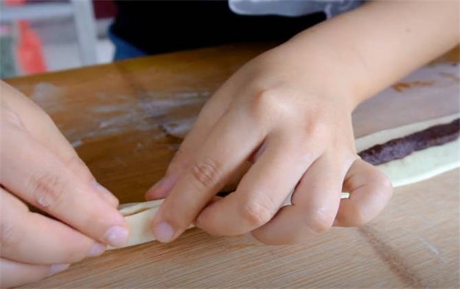 3.每個小面劑都像這樣揉勻按扁按開,中間擠上豆沙餡,把兩邊的面皮捏起來。