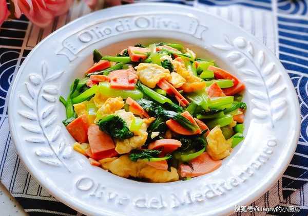 鍋內重新加油,燒熱後放入蒜末爆香,再倒入火腿腸翻炒,炒半分鐘後倒入青菜翻炒。
