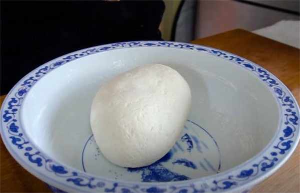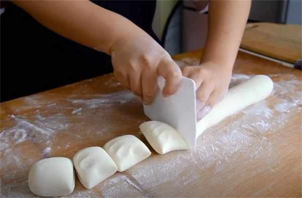 3.餡調好瞭,咱們的面也發好瞭,取出來先排排氣,排完氣後直接搓成長條,然後咱們就開始切面劑瞭。