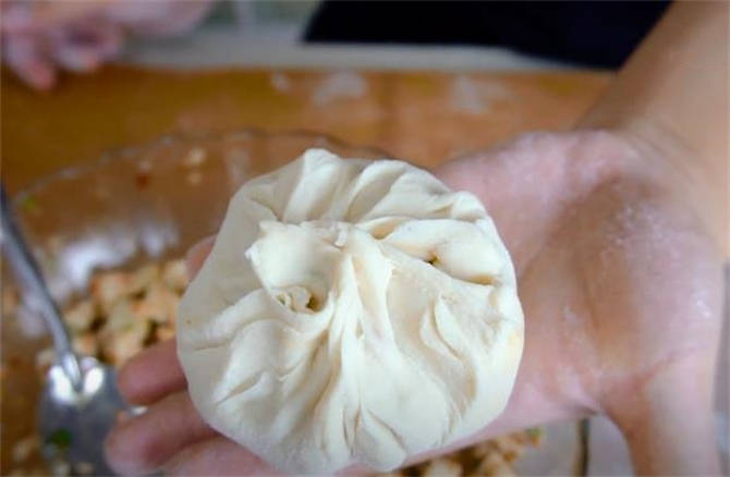5.中間包上幾勺餡,拉出褶子收口就行瞭,這樣小包子生坯就做好瞭。