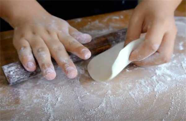 4.把每個小面劑多揉幾下揉勻瞭按扁,搟成中間厚四周薄的餅皮。