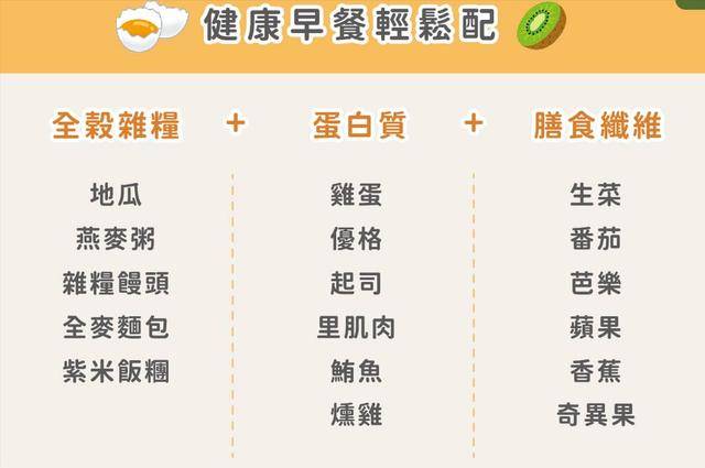 掌握3大關鍵營養素「全谷雜糧、蛋白質、膳食纖維」,能吃進滿滿能量,提升飽足感,腸胃顧好瞭思緒也更順暢。跟著挑選出健康的早餐食物,隨意組合吃出豐富的早餐吧!