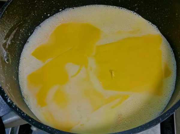 步驟3:把做好的蛋糊倒入平底鍋裡,開小火,添加適量綿白糖,放入準備好的芝士片,慢慢攪拌至芝士片融化:,蛋糊濃稠不粘鍋;