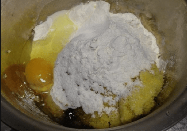 步驟2:小米淘洗幹凈,倒入盤中,上鍋隔水蒸15分鐘後出鍋,倒入盆中,打入2個雞蛋,倒入黑芝麻粒,添加面粉,清水適量添加,揉成面團;