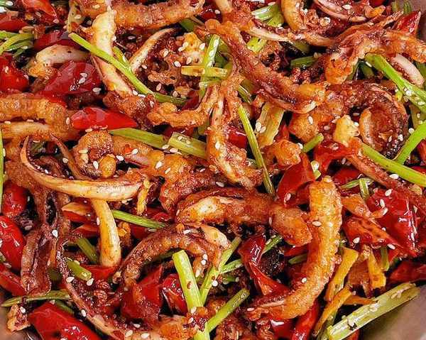 4、鍋內留少量底油,加花椒炒片刻後加薑、蒜,炒香後加幹辣椒、少量鹽,幹辣椒炒至半幹後加魷魚,翻炒片刻加小香芹、辣椒粉、雞精,炒入味後撒上芝麻即可