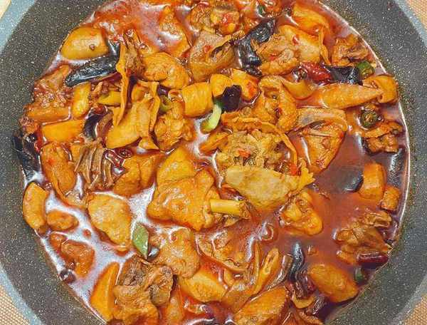 3、鍋中少量油,下入雞肉翻炒,加料酒和醬油;火鍋料放入後繼續翻炒;加筍幹和木耳翻炒;