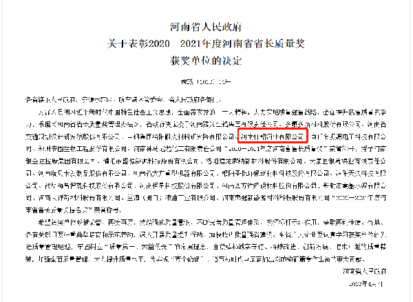 河南省省長質量獎是河南省人民政府頒出的最高質量榮譽,是省政府授予質量水平、質量創新、品牌優勢、經營業績或社會貢獻等在省內處於領先地位,並對省經濟社會發展作出突出貢獻企業的獎勵。我省於2009年設立河南省省長質量獎,自2010年開始評選,為年度獎項。2015年,河南省省長質量獎評選周期由1年變成2年,獲獎單位數量每次不超過8個。