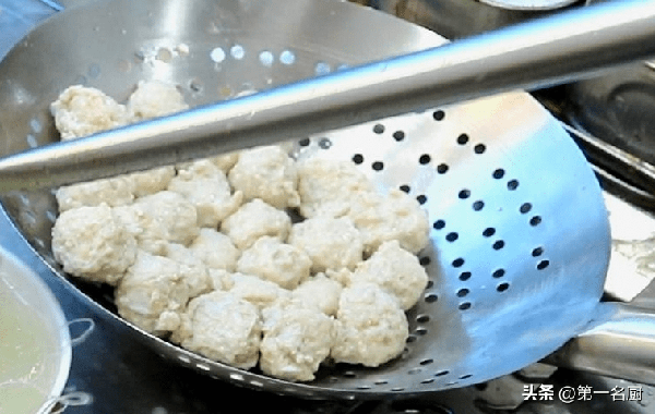 3、鍋內添入適量清水,等水燒開後,改成小火,擠出丸子,挖出丸子放入鍋中,下完以後改大火,煮至湯汁沸騰後,用勺子撇去浮沫,繼續煮三分鐘,撈出丸子備用。