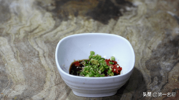 6.大蒜兩粒拍扁切成蒜末,小米椒兩個切成辣椒圈,青線椒一個切成細圈,一起放入碗中,加入陳醋、味極鮮、生抽、香油、紅油各適量,攪拌化開。