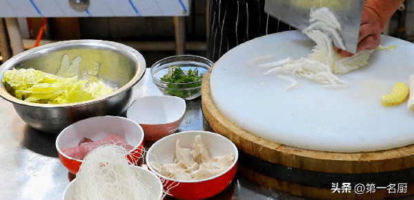 4、然後用熱水把粉絲燙一下。另起鍋添入少許食用油,下入白菜幫,加入少許白醋,上火快速翻炒幾下。