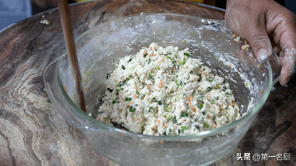 2.一塊老豆腐放入盆中,用鏟子壓成豆腐泥,打入一個雞蛋,倒入蔥花和胡蘿卜粒,加入食鹽、料酒、胡椒粉各適量,攪拌均勻,加入玉米淀粉、面粉適量,再次攪勻備用。