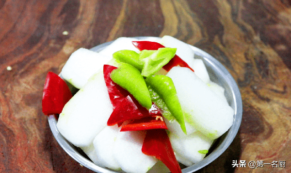 1.準備半個冬瓜,先切成小塊,再切成薄片,放入小盆中備用;半個紅椒、半個青椒同樣切成塊,和冬瓜放在一起。