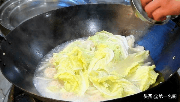 5、然後添入適量清水,放入平菇,煮開以後,加入食鹽,胡椒粉各適量,攪拌化開,下入丸子煮2分鐘,撇去浮沫,下入白菜葉,翻動幾下。