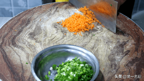 1.準備一把小蔥,切成蔥花,小半個胡蘿卜切成胡蘿卜粒,和蔥花放在一起。