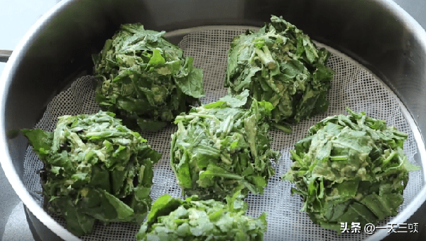 然後團成稍微緊實一些的菜團子,把團子放進鋪有籠屜的蒸屜裡,蒸鍋裡水燒開後直接上鍋蒸,蓋上鍋蓋大火蒸十分鐘。