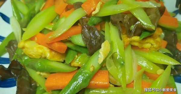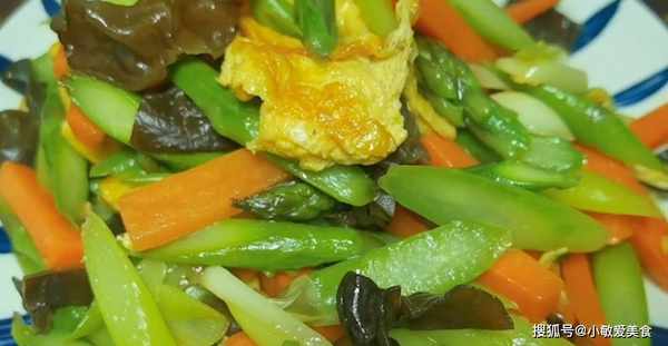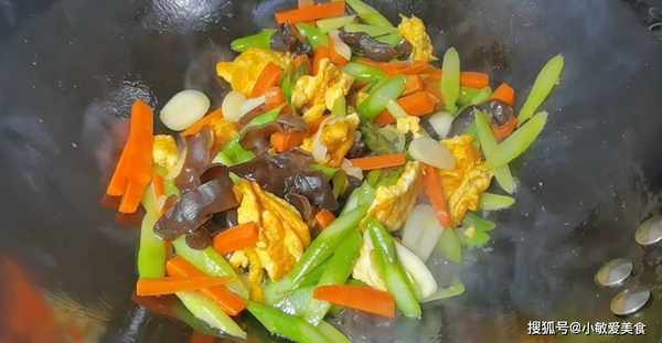 9、鍋裡面放一點食用油,把小料炒出香味,炒香放入胡蘿卜,木耳,蘆筍也放進來,開大火煸炒,炒出鍋氣,翻炒均勻,開始調味,放入食鹽,適量的雞精,炒好的雞蛋塊放進來,翻炒均勻,在沿著鍋邊淋入一小勺清水,這樣能使所有的食材更入味。