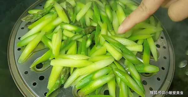 5、鍋裡面加入清水,放上蒸屜,接著把蘆筍放上來,用筷子均勻的鋪開,蓋上鍋蓋,上汽以後蒸三分鐘。