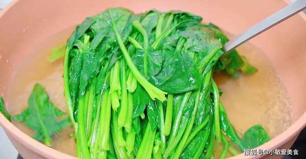 2、鍋中燒水,加入一勺食鹽,再加入幾滴食用油,水開之後,把菠菜焯下水,焯燙的時間也不用太長,大約焯燙30秒,把菠菜燙軟就可以瞭。撈出來,控幹水分,再放入涼水中過一下涼。