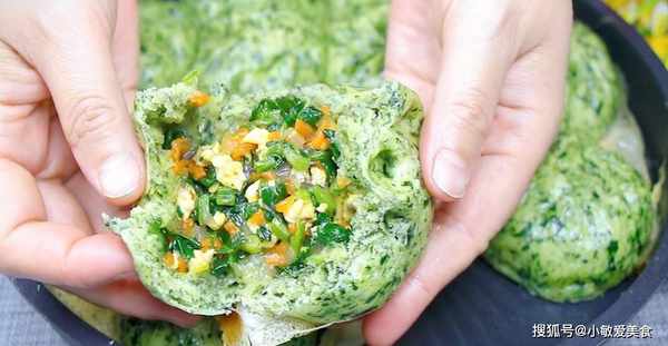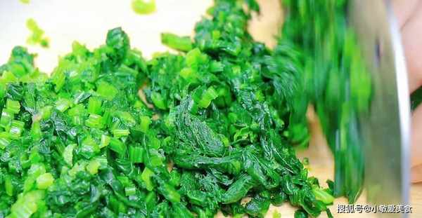 3、過涼後,擠幹水分,放在案板上切碎,把菠菜的下半部分收入碗中備用。再把菠菜葉剁碎一些,剁好放入大碗中,往裡面加入兩克小蘇打,再加入兩克幹酵母攪拌均勻,然後往裡面加入大約200克的普通面粉,再把它攪拌均勻,接著再少量多次的加入大約80毫升溫水,邊倒邊攪拌,攪拌成面絮,下手揉成面團,蓋上保鮮膜,放在一邊醒著備用。