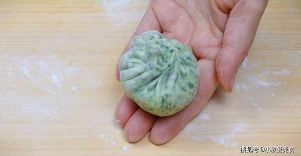 5、面醒發好瞭,取出來,揉一揉,搓成細長條,切成大小均等的面劑,揉圓,壓扁,搟成邊緣薄中間厚的面皮,放上一大勺餡料,用平時包包子的手法包起來。整理一下形狀,這樣一個生坯就做好瞭。