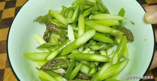 1、蘆筍買回來之後,先把根部的一些皮去掉,洗幹凈之後放在案板上斜刀切成片。切好以後先放入一個大碗中,放入一勺食用油拌均勻,鎖住蘆筍的切口,不會出水,先放一旁備用。