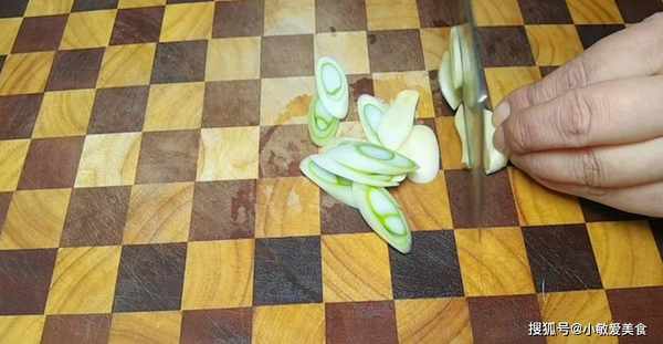 準備一段大蔥,斜刀切成片,大蒜也切成片,切好放一旁備用。