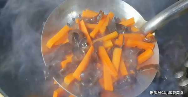 7、鍋裡面的水也不要倒掉,把木耳先放進來,焯水兩分鐘,兩分鐘之後放入胡蘿卜,再焯水30秒左右,然後撈出控水。