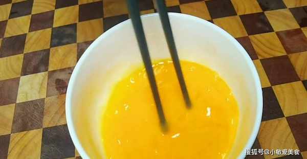 4、小碗裡面打入兩顆雞蛋,用筷子充分的攪散備用。