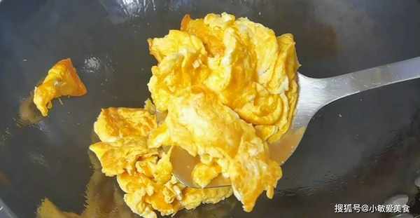8、炒鍋裡面放入食用油,油熱倒入雞蛋液,煎至雞蛋液底部凝固,推動一下使其受熱均勻,煎至底部金黃,翻一個面,接下來用鏟子把雞蛋分成小塊翻炒均勻,炒出雞蛋的香味,先盛出備用。