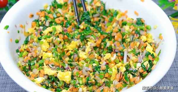 4、一個洋蔥對半切開,切成小丁,切好之後放入大碗中。一根胡蘿卜切成小丁,切好跟洋蔥放在一起,再放入切好的菠菜,提前炒好的雞蛋也加進來,加入蔥花,接下來調味,加入鹽,花椒粉,再加一勺蠔油,最後加幾滴食用油,用筷子攪拌均勻。