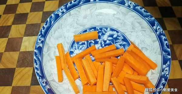 2、準備半根胡蘿卜,切成稍微厚一點的片,再切成粗一點的條,三公分長就可以。切好之後放一旁備用。
