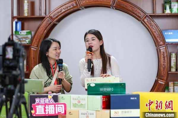 圖為兩位主播在茶博會現場直播帶貨。 瞿宏倫 攝