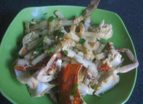 白蟹炒年糕:蟹洗凈切成塊備用,鍋內放入適量的食油開中火,鍋熱後放入生薑絲煸香,倒入白蟹翻炒。然後加入年糕條繼續翻炒,加入適量的黃酒、鹽、一點醬油及至年糕、白蟹炒熟,撒上一點胡椒粉、蔥花炒勻即可。