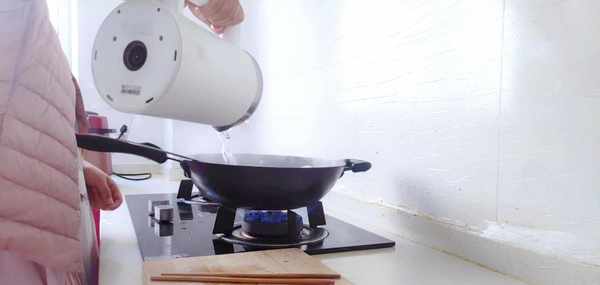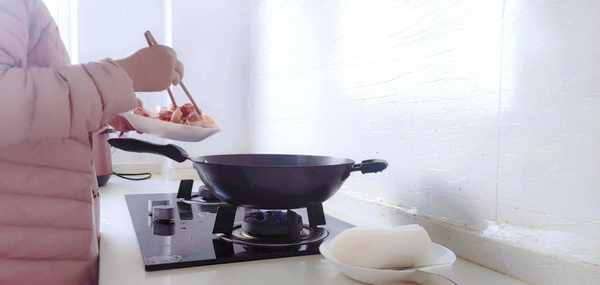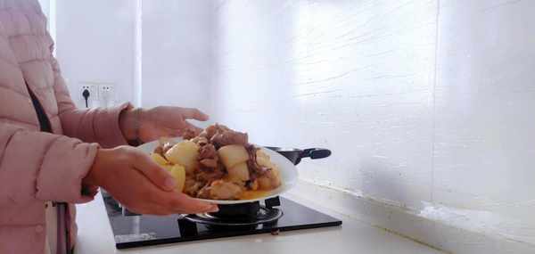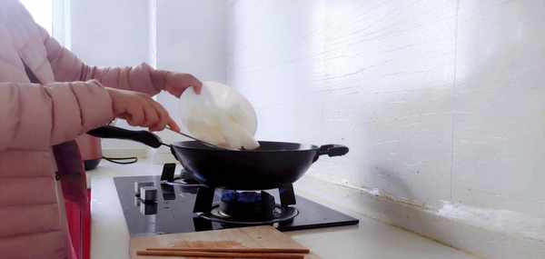 第三步:當雞塊煸炒出油脂之後,把大蒜放進鍋裡一起翻炒出香味,再把白蘿卜塊放進鍋裡一起翻炒,翻炒的同時加入適量的食用鹽調味,最後再加入適量的清水,蓋上鍋蓋大火燉煮入味。