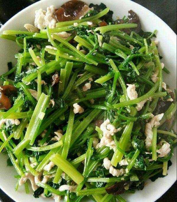 芹菜炒肉絲:屬傘形科植物。有水芹、旱芹、西芹三種,功能相近,藥用以旱芹為佳。旱芹香氣較濃,稱"藥芹"。芹菜富含蛋白質、碳水化合物、胡蘿卜素、B族維生素、鈣、磷、鐵、鈉等,非常不錯的一種蔬菜!