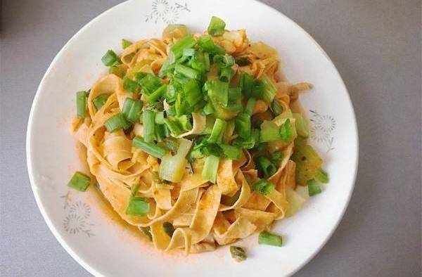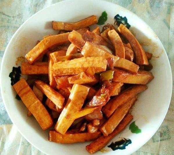 炒香幹:豆腐的再加工制品,硬中帶韌,咸香爽口;香幹在制作過程中會添加食鹽、茴香、花椒、大料、幹薑等調料,既香又鮮,久吃不厭。可制作多種菜肴,可冷拌,可熱炒,可油炸,可烤制,做成後俱鮮香可口,價廉物美,營養豐富,受到城鄉人民的喜愛。