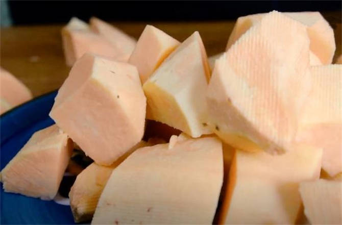 1.先把表面的皮給削掉,一會兒咱們再洗一洗,然後切成小塊。