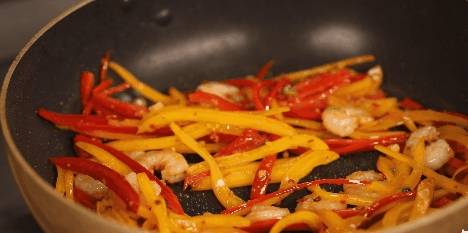 將蒜碎、小米椒炒香,放入蝦仁,用魚露調味;炒香後加入蔥、彩椒、蓋仔粉、調好的醬汁,將蓋仔粉拌勻。