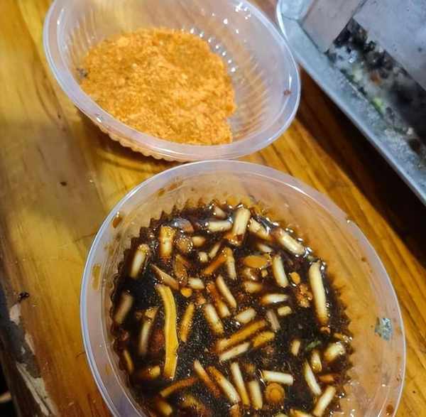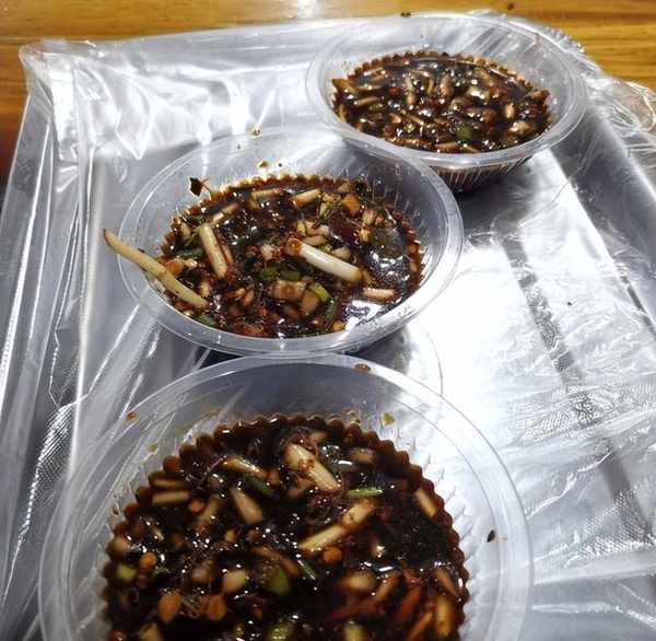 貴州燒烤喜歡放辣椒面,這種辣椒面是用當地的辣椒制作而成,香而不辣很開胃,每一種食材所用的調料都不同,像烤蔬菜除瞭要放辣椒面,還要加甜面醬,而烤五花肉,要用生菜來包著吃,還要加蘸水,靈魂蘸水裡除瞭有折耳根,還要有花生酸蘿卜,其口感酸酸甜甜辣辣,剛好可以中和五花肉的肥膩。還有什麼五香辣椒面、胡辣椒等,調料太豐富,不是本地人根本數不清。