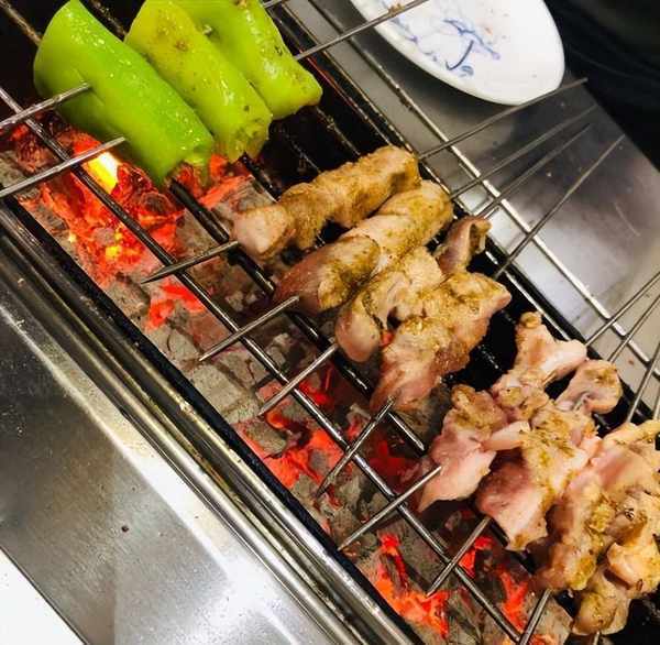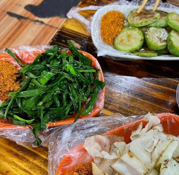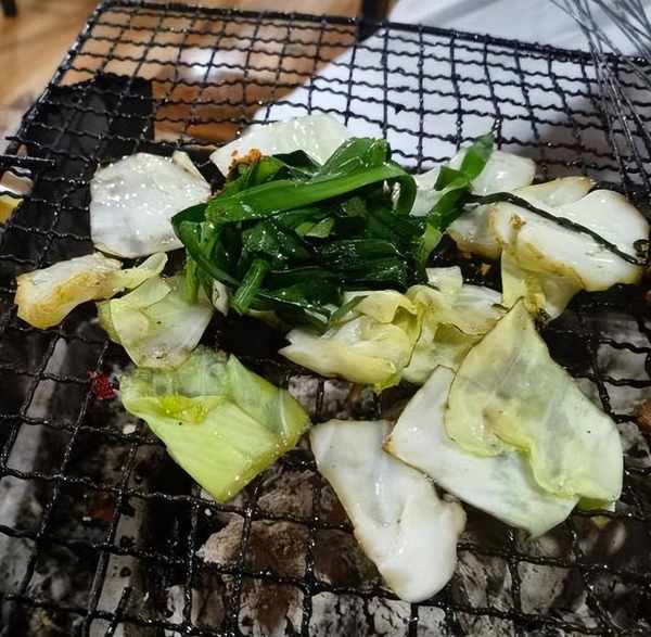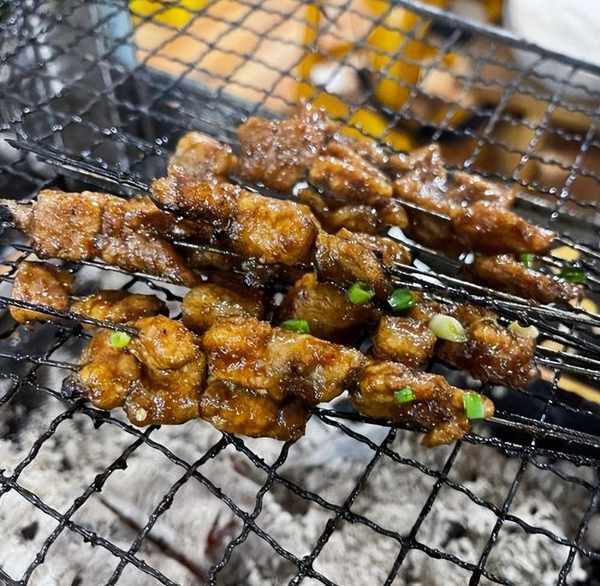 這個醬爆很入味,麻辣就是多瞭一份辣味,兩者都是細嫩爽口,單吃不錯,沾蘸水吃又還是另一種味道,好多客人都是手拿十幾串,一口一串吃得停不下來。當然他們傢也有點像淄博燒烤一樣,會給客人一個小爐子上面放著鐵網,蔬菜這些都自己烤,配上幹辣椒面和折耳根蘸水,那叫一個絕。