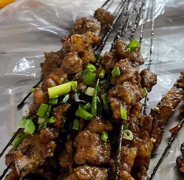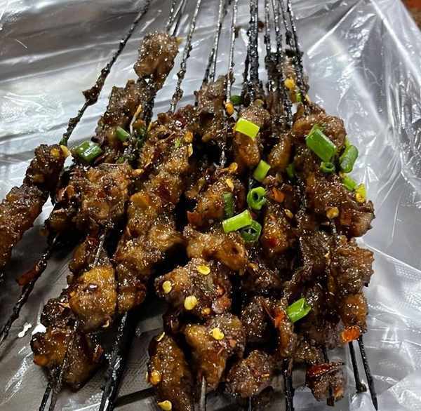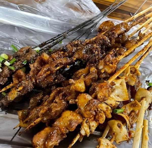 而且除瞭烤肉烤蔬菜等普通菜色,貴州人還愛吃烤魚烤腦花之類的,烤魚外焦裡嫩食材豐富味道也是多層次有,烤腦花全靠折耳根提味,去掉腥味,吃起來滿嘴冒香。而趙立強說的燒烤指的是當地一種烤肉,價格很實惠,主要是牛肉牛黃筋,都是一元一串。這種烤肉有兩種味道,是醬爆和麻辣的,廚師不停地烤,烤好之後服務員會給你端過來,要吃多少拿多少,一點也不擔心會點多瞭,能吃多少隨時都可以拿。肉很嫩肉量也比較多,肉質很新鮮,來得早還可以看到服務員們串肉的場景。